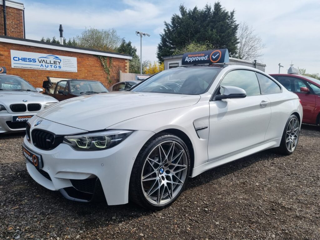 Chess Valley Autos is delighted to present this stunning 2019 BMW M4 COMPETITION covered 54000 miles on the clock with only 3 previous registered keeper. Finished in Mineral White with a Full Black Extended Merino Leather Interior. Equipped with, 666M 20″ Staggered Alloy Wheels, M DCT Transmission, Ghost Alarm, Surround Camera System, Head-up display Comfort Access, Sun Protection Glass, High Beam Assistant, Speed Limit Display, Full Electric Memory Seats, Front Heated Seats, Front and Rear Parking Sensors, Cruise Control, Enhanced Bluetooth, WiFi, Satellite Navigation System BMW, Sliding Front Armrest, Automatic Windscreen Wipers, Automatic Lighting Control, making your car-buying process seamless and convenient for you. Our 2019 BMW M4 DCT is offered in outstanding condition, giving you the peace of mind that your vehicle is in top condition.